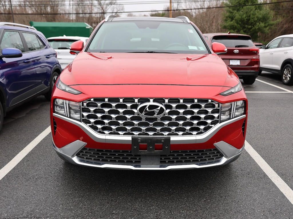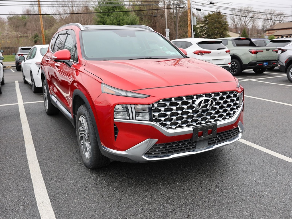 Certified. Calypso Red 2023 Hyundai Santa Fe SEL AWD 8-Speed Automatic with SHIFTRONIC 2.5L I4 Fresh Oil Change, 18" x 7.5J Alloy Wheels, H-Tex Leatherette Seat Trim, Heated front seats, Option Group 02, Premium Package, 12.3" LCD Multi-Information Display, 4-Wheel Disc Brakes, 6 Speakers, 8-Way Power Passenger Seat, ABS brakes, Acoustic-Laminated Front Side Windows, Air Conditioning, Alloy wheels, AM/FM radio: SiriusXM, Apple CarPlay & Android Auto, Auto High-beam Headlights, Auto-Dimming Rear-View Mirror, Automatic temperature control, Axle Ratio: 4.081, Blind-Spot View Monitor, Brake assist, Bumper Applique, Bumpers: body-color, Cargo Net, Cargo Package, Cargo Tray, Carpeted Floor Mats, Chrome Front & Rear Bumper Accents, Chrome Interior Accents, Delay-off headlights, Driver door bin, Driver vanity mirror, Dual front impact airbags, Dual front side impact airbags, Electronic Stability Control, Emergency communication system, Exterior Parking Camera Rear, First Aid Kit, Four wheel independent suspension, Front anti-roll bar, Front Bucket Seats, Front Center Armrest, Front dual zone A/C, Front reading lights, Fully automatic headlights, harman/kardon® Audio System, Heated door mirrors, Heated Front Bucket Seats, Illuminated entry, Leather steering wheel, LED Interior Lights, LED Taillights, Low tire pressure warning, Manual Rear Side Sunshades, Mudguards, Navigation System, Occupant sensing airbag, Outside temperature display, Overhead airbag, Overhead console, Panic alarm, Panoramic Sunroof, Passenger door bin, Passenger vanity mirror, Power door mirrors, Power driver seat, Power Liftgate, Power Release 2nd Row Seats, Power steering, Power windows, Radio: AM/FM Display Audio, Rear anti-roll bar, Rear seat center armrest, Rear window defroster, Rear window wiper, Remote keyless entry, Security system, Silver Front Grille, Speed control, Speed-sensing steering, Split folding rear seat, Spoiler, Stain-Resistant Cloth Seat Trim, Steering wheel mounted audio controls, Surround View Monitor, Tachometer, Telescoping steering wheel, Tilt steering wheel, Traction control, Trip computer, Turn signal indicator mirrors, Variably intermittent wipers, 18" x 7.5J Alloy Wheels, H-Tex Leatherette Seat Trim, Heated front seats, Option Group 02, Premium Package.