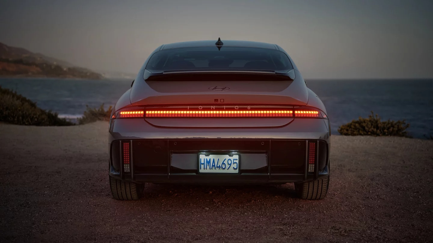 The 2024 Hyundai IONIQ 6 has a beautifully refined shape with low front and rear ends and an elegant sloping roofline. Along the sides, the IONIQ 6 has twin body lines that arc between the housings, while in the back, its tapered rear end culminates in a large elliptical spoiler.