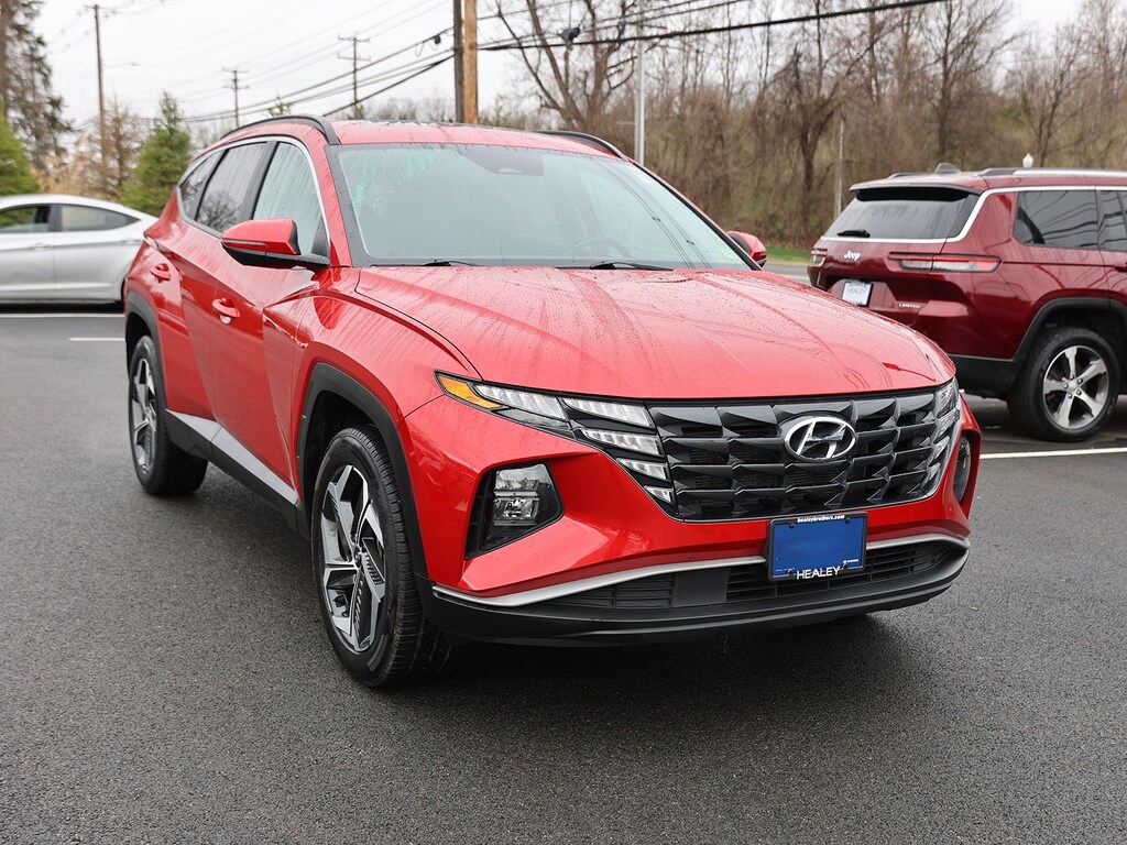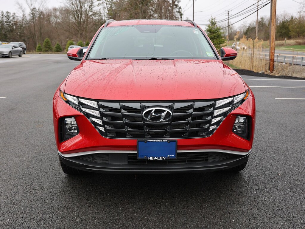 Calypso Red 2022 Hyundai Tucson SEL AWD 8-Speed Automatic with SHIFTRONIC 2.5L I4 DGI DOHC 16V LEV3-ULEV70 187hp Fresh Oil Change, Cargo Cover, Convenience Package, Option Group 02, Passenger door bin, Power Sunroof, Wheels: 19" x 7.5J" Machine-Face Finish Alloy, 10.25" Digital Instrument Cluster, 3.648 Axle Ratio, 4-Wheel Disc Brakes, 6 Speakers, ABS brakes, Air Conditioning, Alloy wheels, AM/FM radio: SiriusXM, Apple CarPlay & Android Auto, Auto High-beam Headlights, Auto-Dimming Interior Mirror w/Homelink, Brake assist, Bumpers: body-color, Carpeted Floor Mats, Delay-off headlights, Digital Key, Driver door bin, Driver vanity mirror, Dual Automatic Temperature Control, Dual front impact airbags, Dual front side impact airbags, Electronic Stability Control, Emergency communication system: Blue Link Connected Car Service (3-year complimentary subscription), First Aid Kit, Four wheel independent suspension, Front anti-roll bar, Front Bucket Seats, Front Center Armrest, Front reading lights, Fully automatic headlights, Hands-Free Power Liftgate w/Auto-Open, Heated door mirrors, Heated Front Bucket Seats, Heated front seats, Illuminated entry, Leather-Wrapped Shift Knob, Leather-Wrapped Steering Wheel, LED Interior Lights (Room, Map), Low tire pressure warning, Occupant sensing airbag, Outside temperature display, Overhead airbag, Overhead console, Panic alarm, Passenger vanity mirror, Power door mirrors, Power driver seat, Power steering, Power windows, Radio data system, Radio: AM/FM/HD/SiriusXM Audio System, Rear anti-roll bar, Rear Bumper Applique, Rear seat center armrest, Rear window defroster, Rear window wiper, Remote keyless entry, Roof rack: rails only, Security system, Speed control, Split folding rear seat, Spoiler, Stain & Odor Resistant Cloth Seat Trim, Steering wheel mounted audio controls, Tachometer, Telescoping steering wheel, Tilt steering wheel, Traction control, Trip computer, Turn signal indicator mirrors, Ultrasonic Rear Occupant Alert, Variably intermittent wipers, Wheel Locks, Wheels: 17" x 7.0J" Alloy, Wireless Phone Charging, Cargo Cover, Convenience Package, Option Group 02, Passenger door bin, Power Sunroof, Wheels: 19" x 7.5J" Machine-Face Finish Alloy.